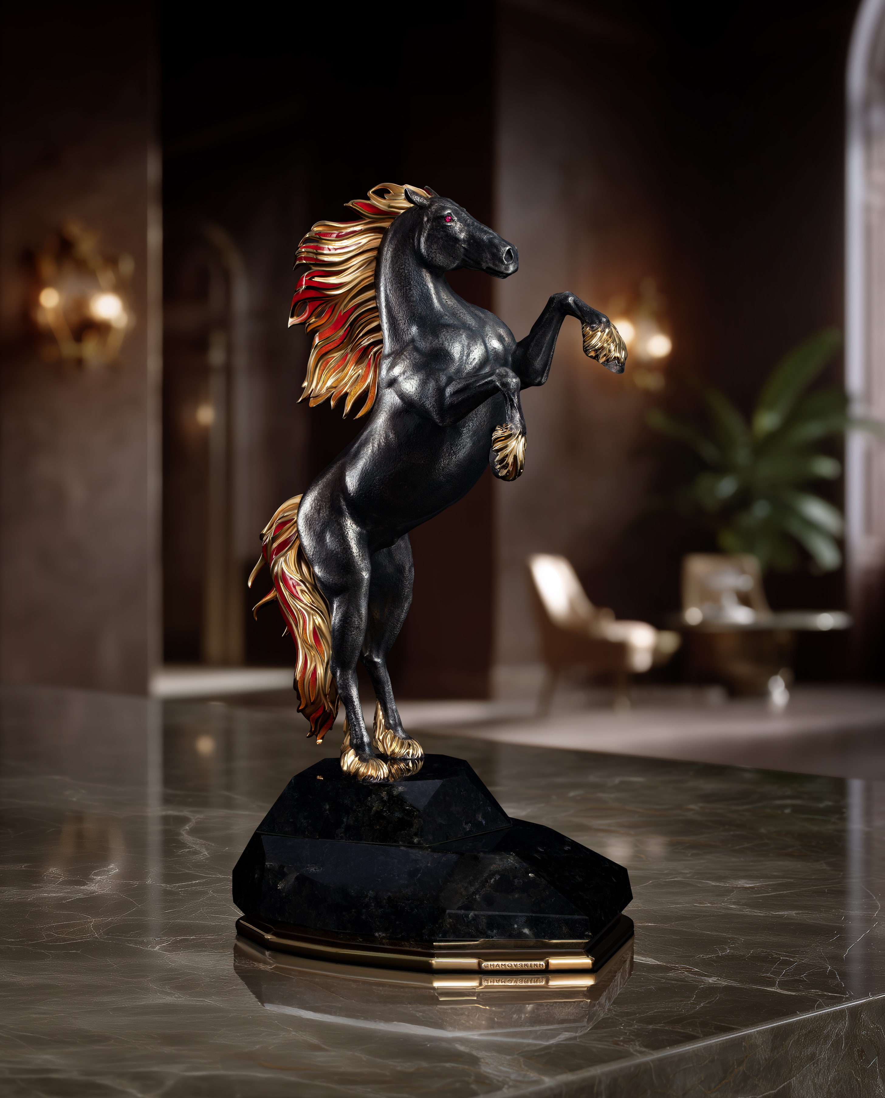 В преддверии новогодних праздников бренд выпустил серию настольных скульптур, посвященных символу 2026 года — одному из самых грациозных созданий на Земле, символу силы и скорости. В скульптуре «Огнегривый конь» матовая фигура, отлитая из серебра с применением технологии оксидирования, выразительные рубиновые глаза, детали, покрытие чистым золотом, и яркая ювелирная эмаль, акцентирующая развевающийся хвост и огненную гриву, подчеркивают благородное величие породистого скакуна. Ощущение монументальности усиливает постамент из лабрадорита. Драгоценный символ 2026 года выполнен ограниченным тиражом, что подтверждает индивидуальный номер, присвоенный каждой статуэтке.