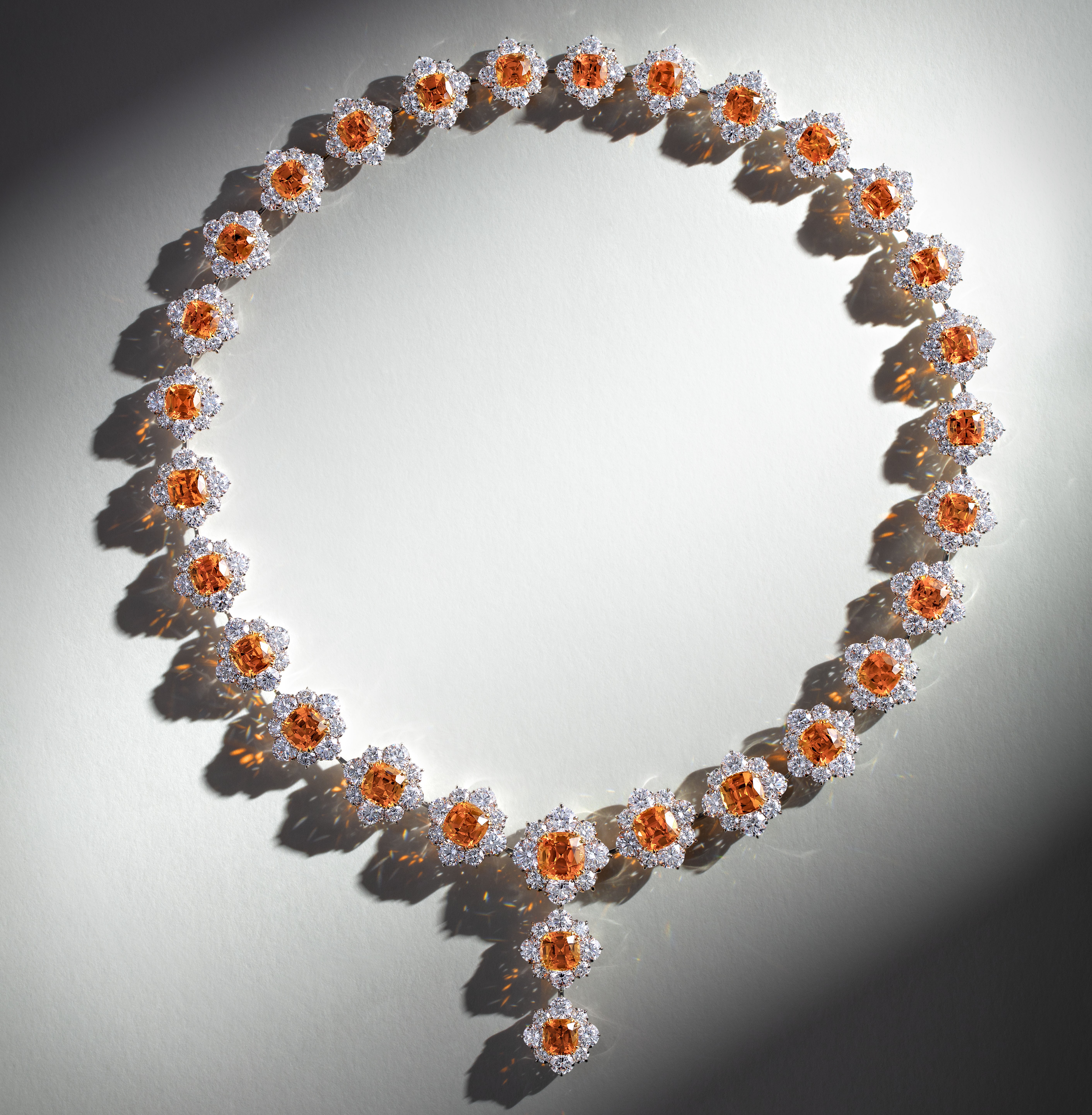 В колье Fantine представлен самый желанный цвет спессартинов — смелый и насыщенный оранжевый, без примеси желтого, красного или коричневого. А вес каждого из камней в украшении – около 2 карат – большая редкость в природе.