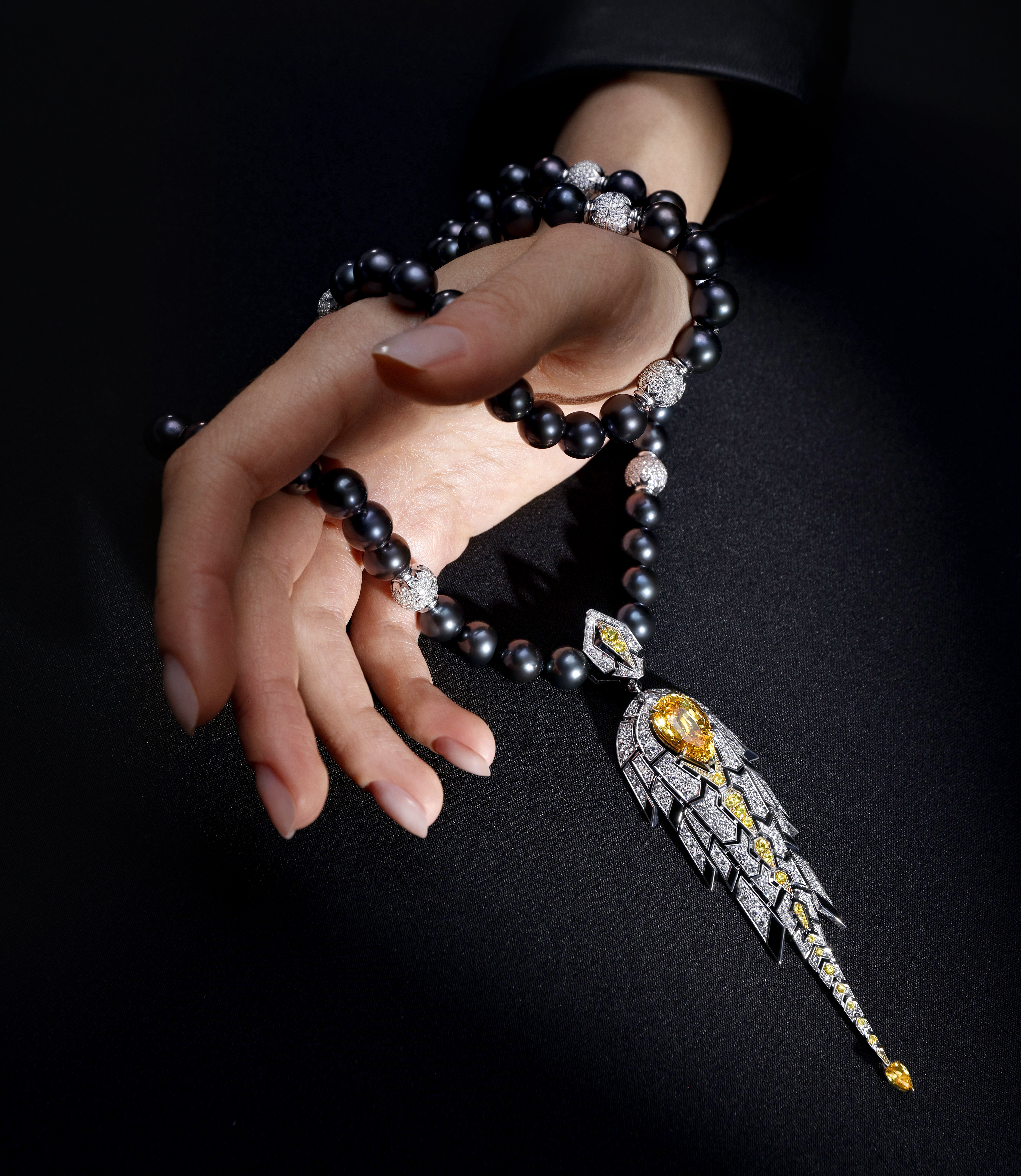 Одно из новых произведений ювелирного дома — блистательное колье «Мерлион», вдохновленное символом Сингапура, мифическим полульвом-полурыбой. В центре украшения сияет превосходный сапфир noheat цвета Vivid Yellow более 10 ct. Его насыщенный солнечный цвет подчеркнут роскошной инкрустацией из более чем 900 бриллиантов и желтых сапфиров, которая создает восхитительный контраст с премиальным черным жемчугом и нанокерамикой. Несколько замков, скрытых в инкрустации, позволяют менять длину жемчужной нити и носить украшение трансформер в формате браслета или чокера.