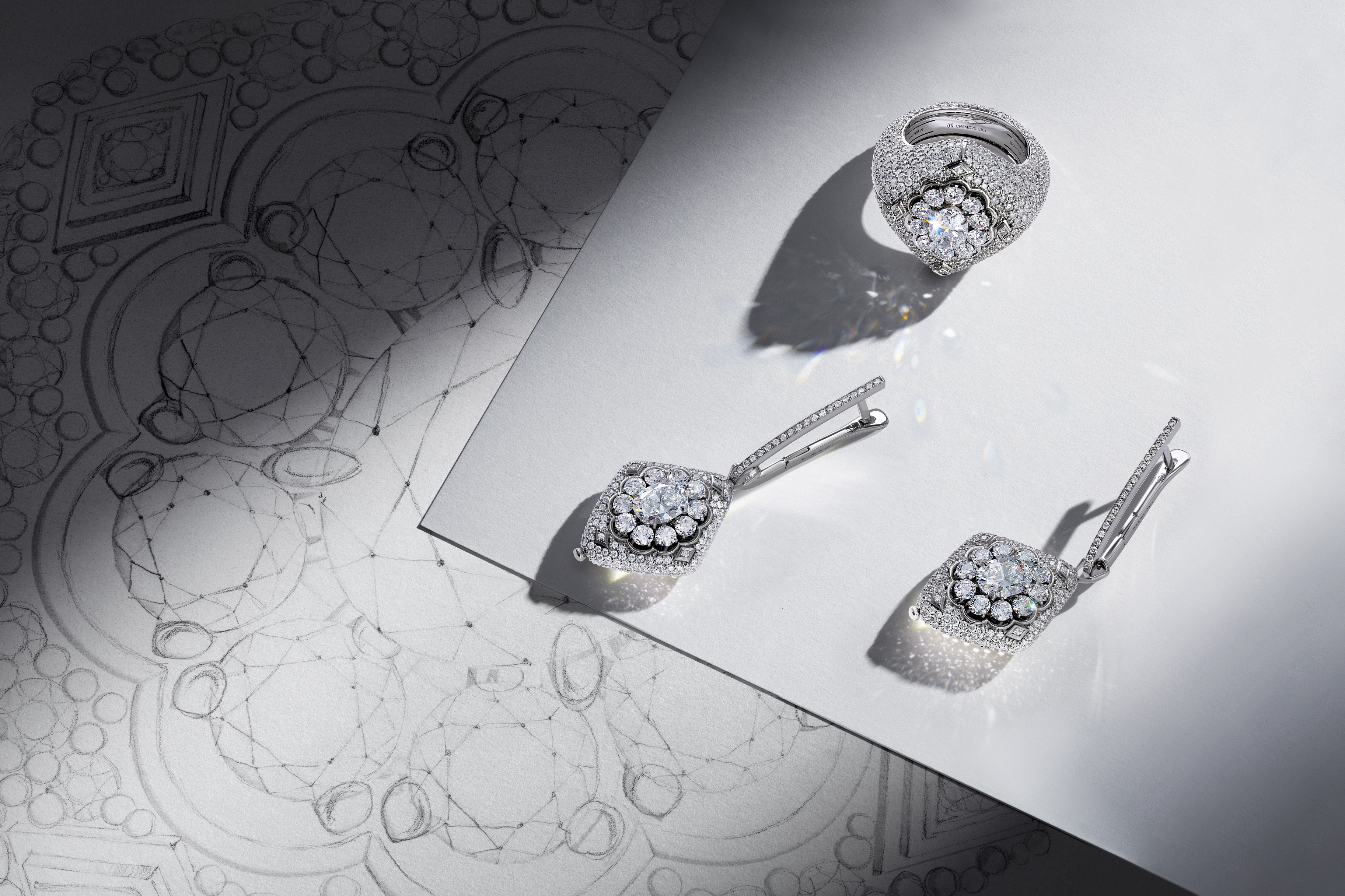 В первом акте серьги предстают перед нами во всем своем величии. Подвесные элементы геометрической формы, инкрустированные 408 бесцветными бриллиантами, словно двигаются в изящном танце. Удивительное природное сияние драгоценного паве приковывает к себе восхищенные взгляды, оставляя яркое и незабываемое впечатление.
