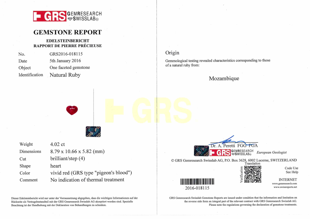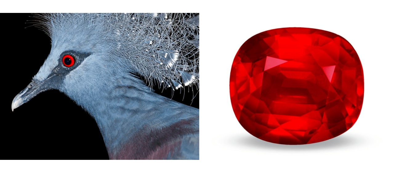 Конечно, древние бирманцы не понаслышке знали какого цвета голубиная кровь, однако, позже Швейцарская лаборатория исследования драгоценных камней (GRS) предложила более гуманный вариант. Эталонный цвет рубина был найден на радужке глаза голубя, тем самым опровергнув сравнение с кровью птицы.