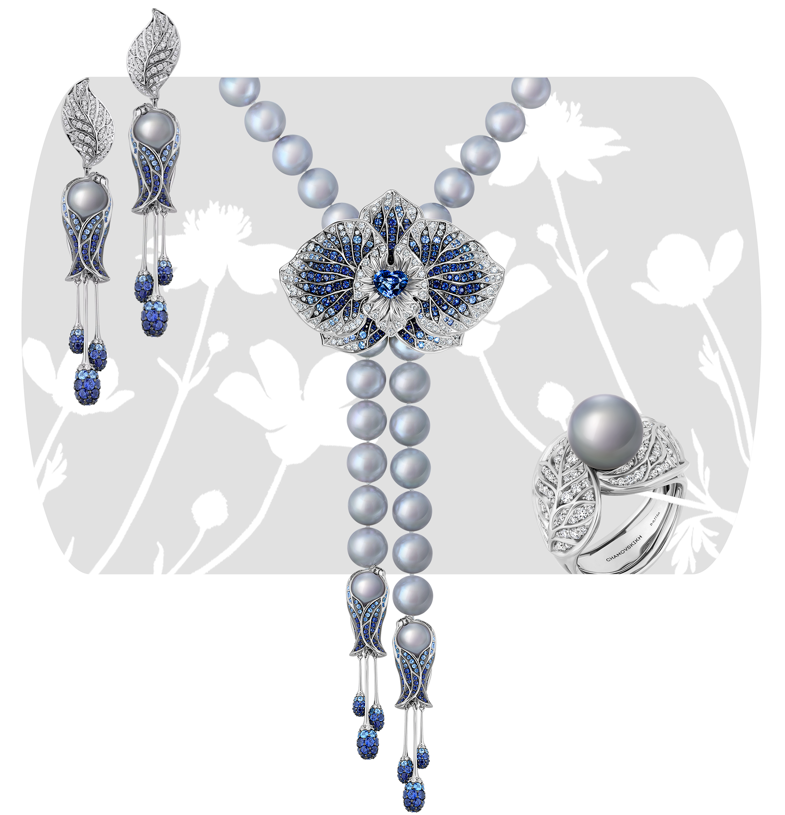 Парюра L’amour de ma vie – ювелирное воплощение цветущей орхидеи. Художники Дома Chamovskikh поставили перед собой амбициозную задачу отразить в украшении сердечное признание самому дорогому человеку. Так нежные бутоны обрели концептуальное значение. Изысканное сочетание бриллиантов и сапфиров синего цвета отражает красоту распустившихся лепестков. Притягательный сапфир огранки «сердце» в центре добавляет теплоты и сияния драгоценной композиции. Роскошные аксессуары сета наделены свойствами трансформации, превращаясь в разные по сложности изящные конструкции.