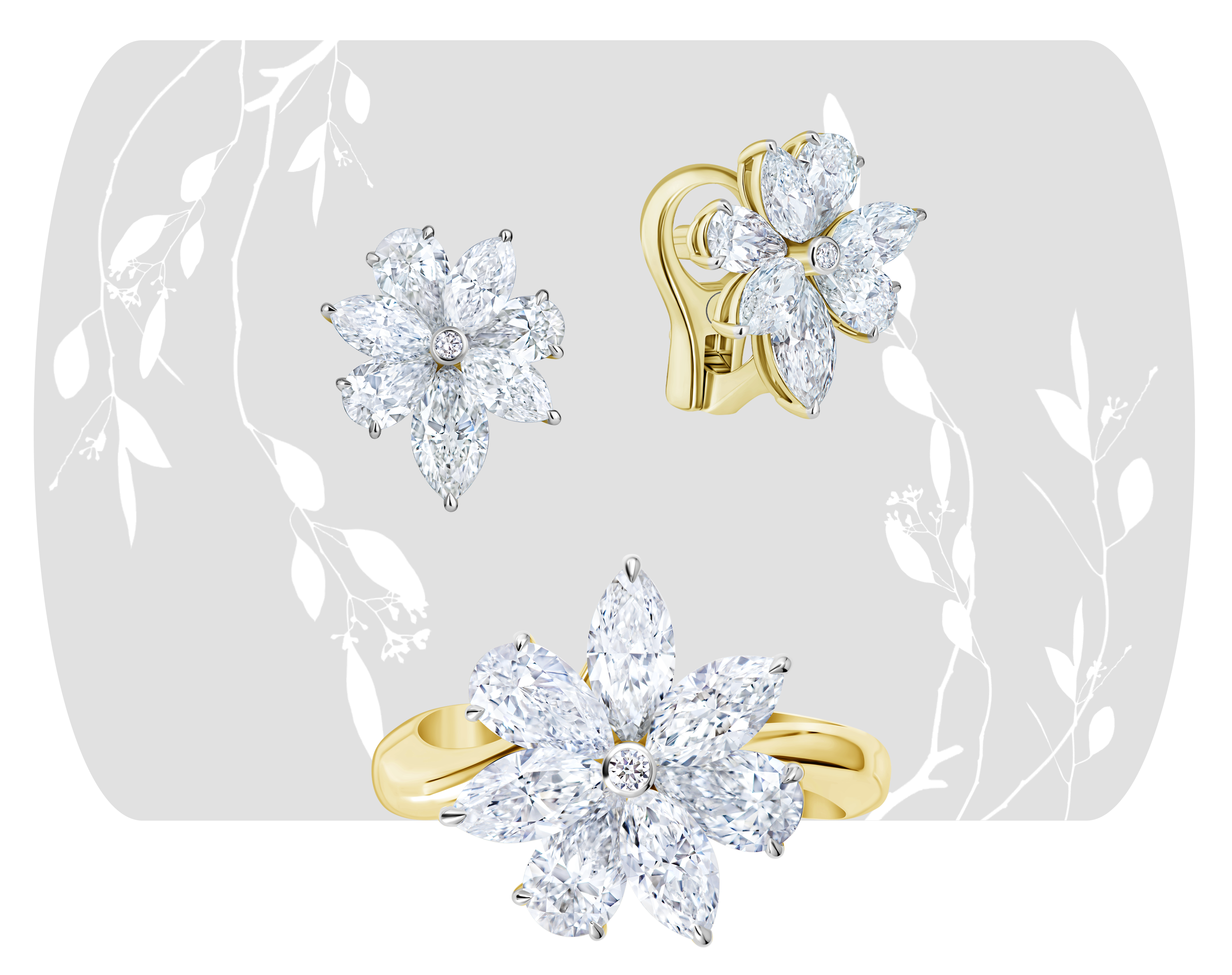 Классическая коллекция бренда также разнообразна на флористические мотивы. Новинка ювелирного дома – серьги и кольцо, в которых изящные лепестки инкрустированы бриллиантами фантазийных огранок «маркиз» и «груша». Теплый оттенок желтого золота придает композиции сета эффект солнечного сияния.