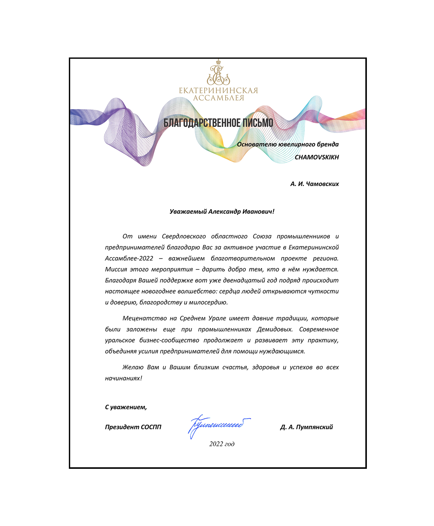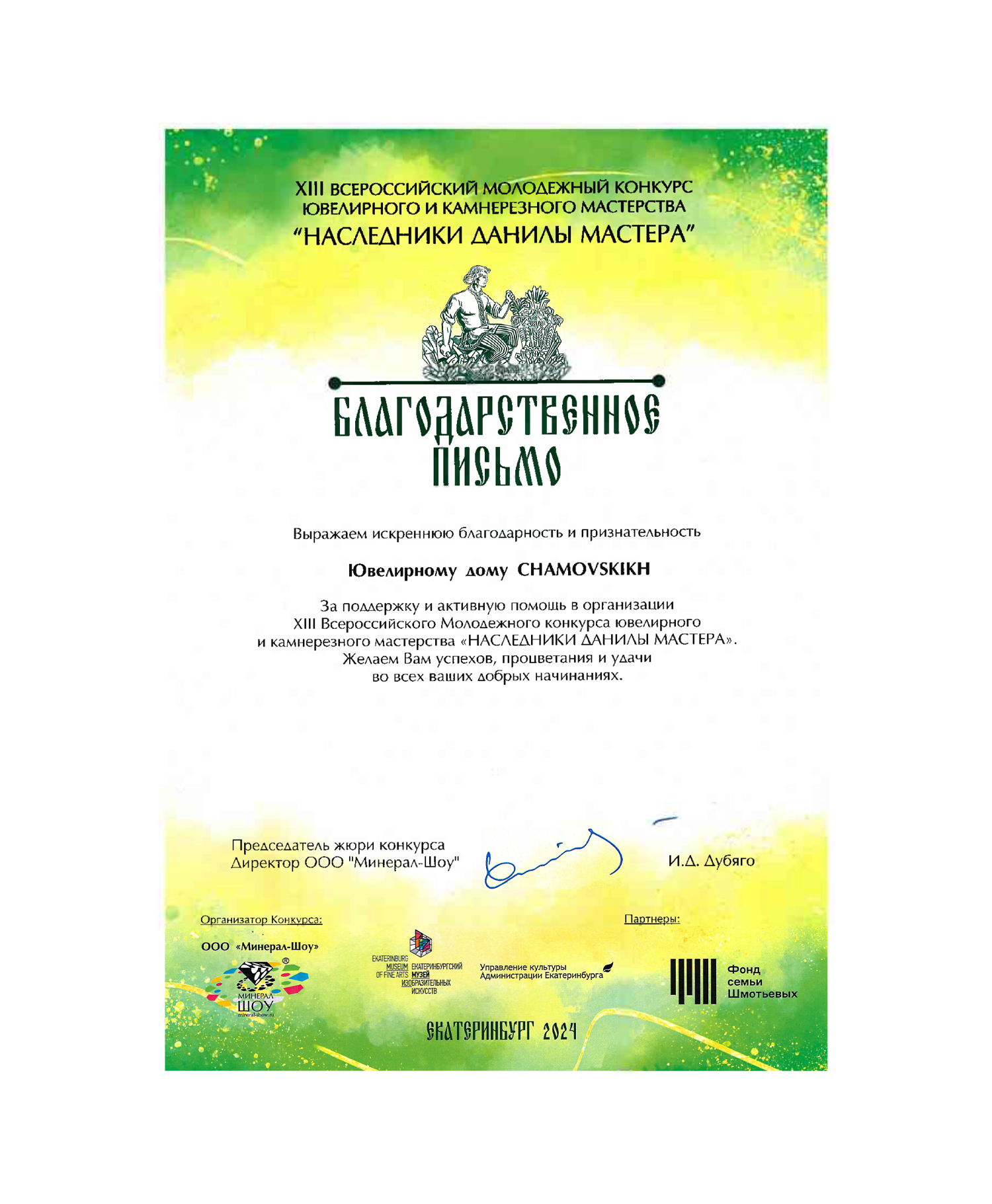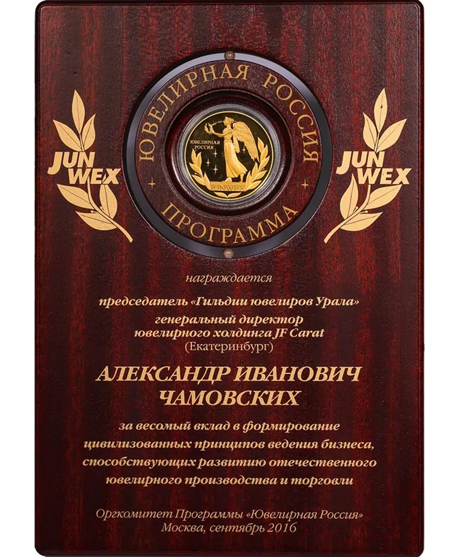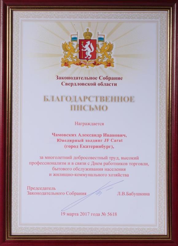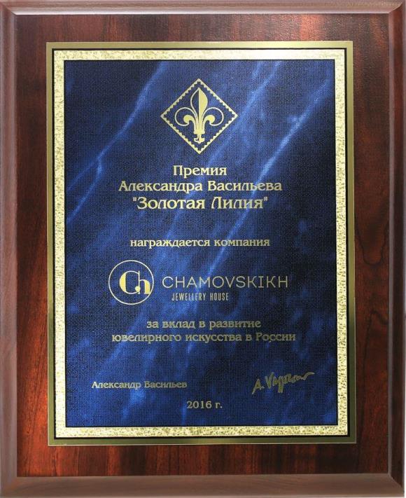 Награда Чамовских А.И. от Оргкомитета Программы "Ювелирная Россия".