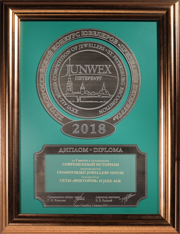 Диплом Junwex Петербург 1 место в номинации "Современный историзм" 2018 г. Сет "Виктория" и сет "Jazz Age"