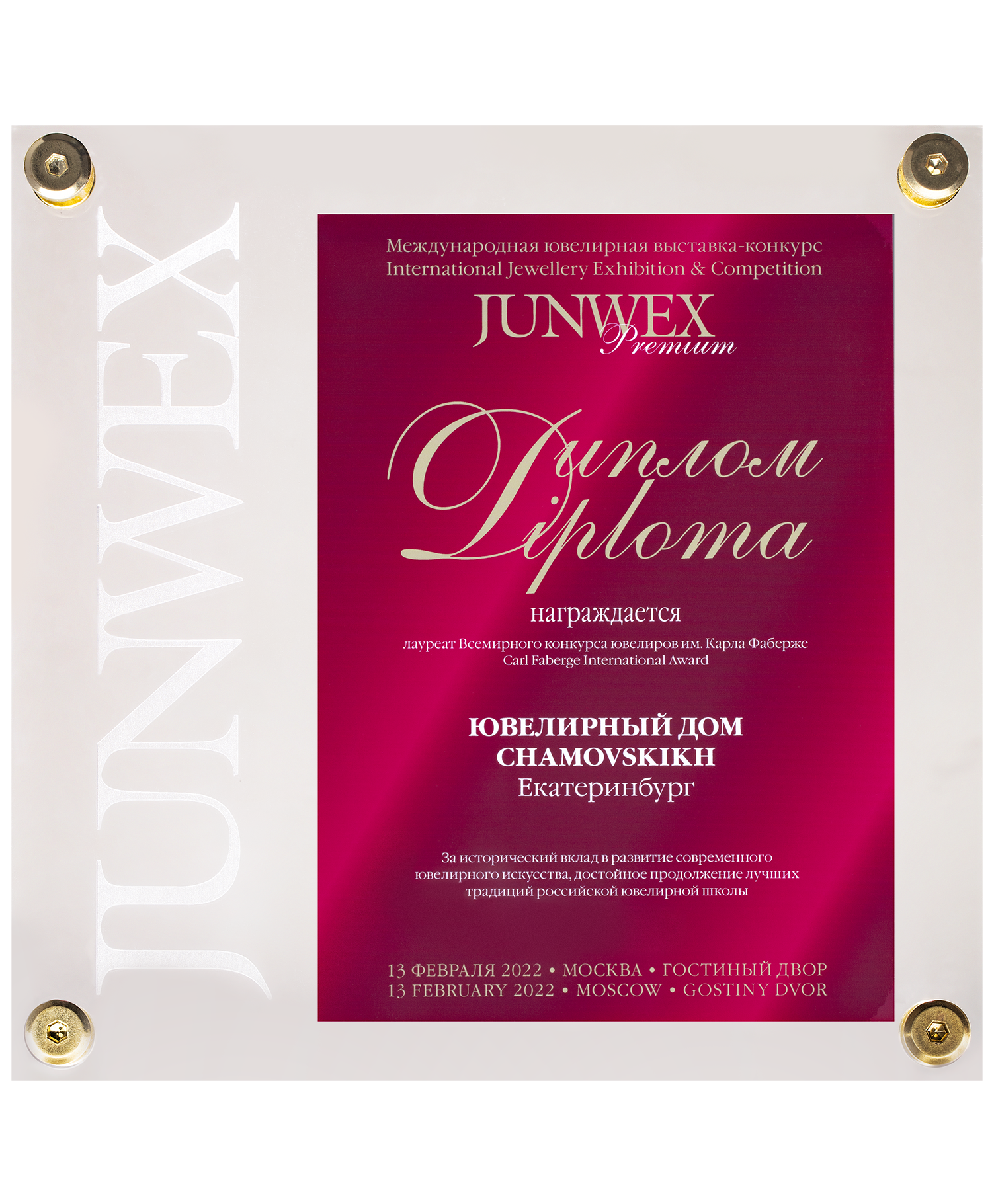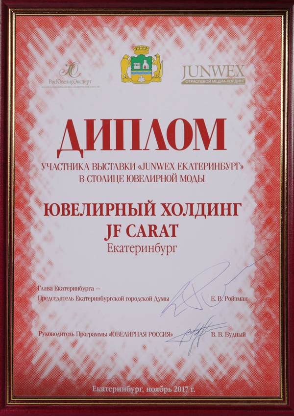 Диплом участника выставки "JUNWEX ЕКАТЕРИНБУРГ" в столице ювелирной моды
