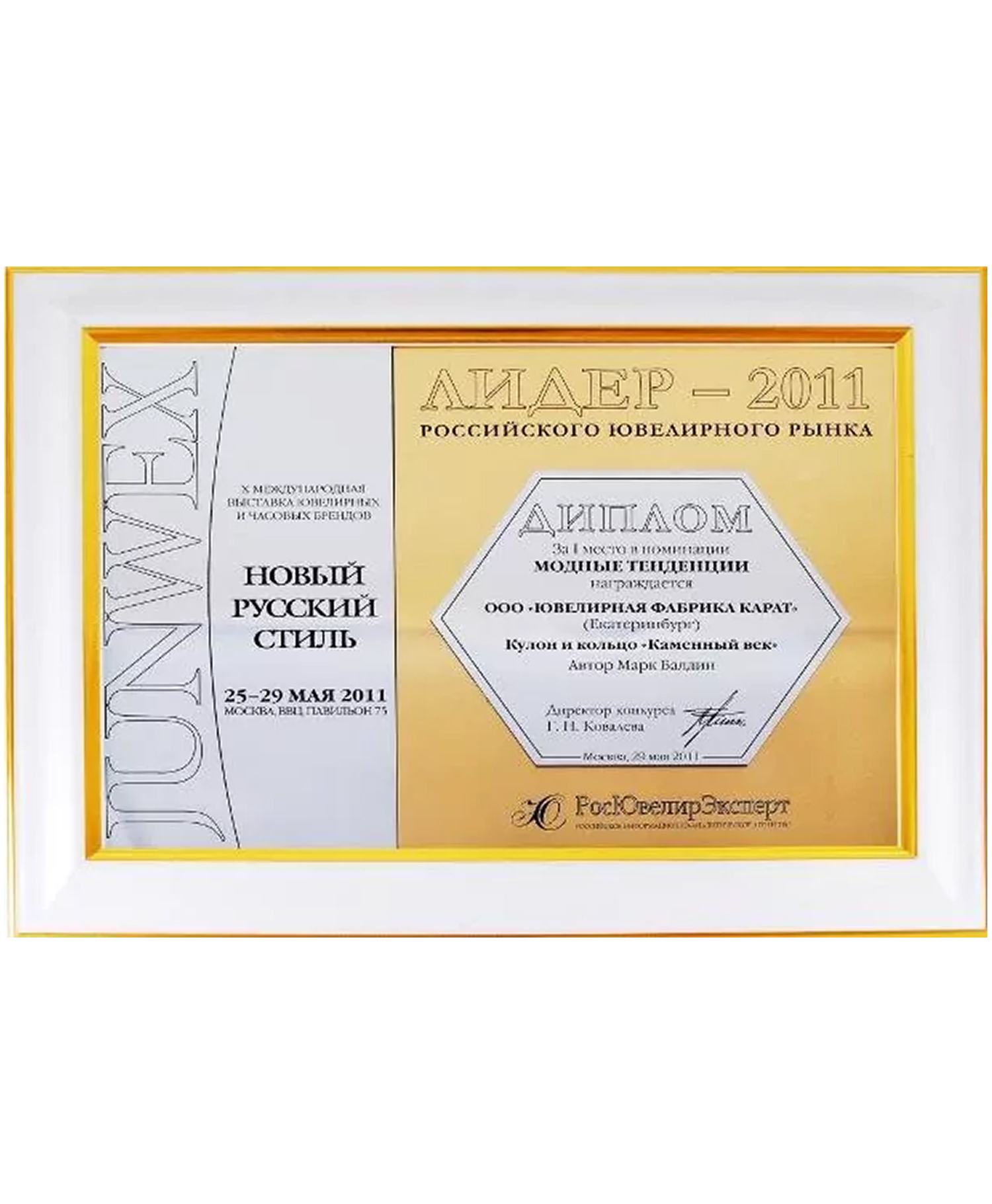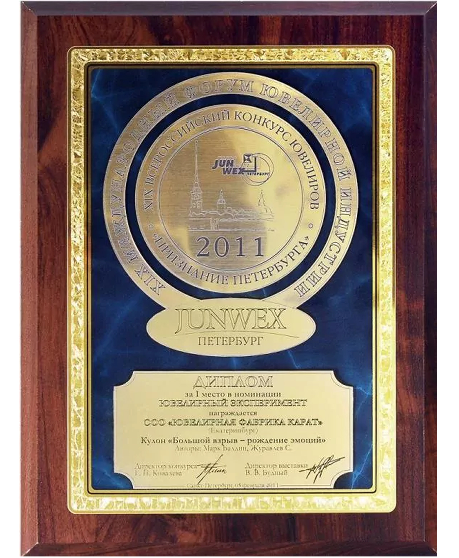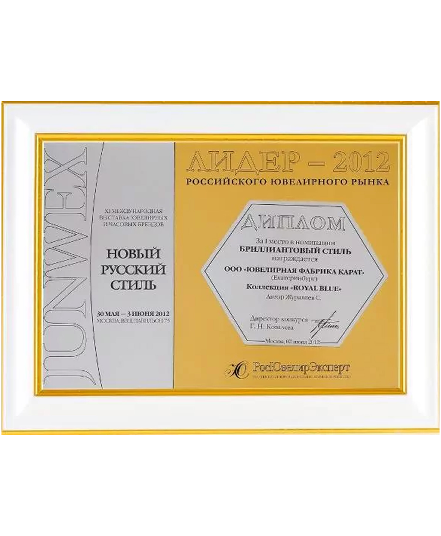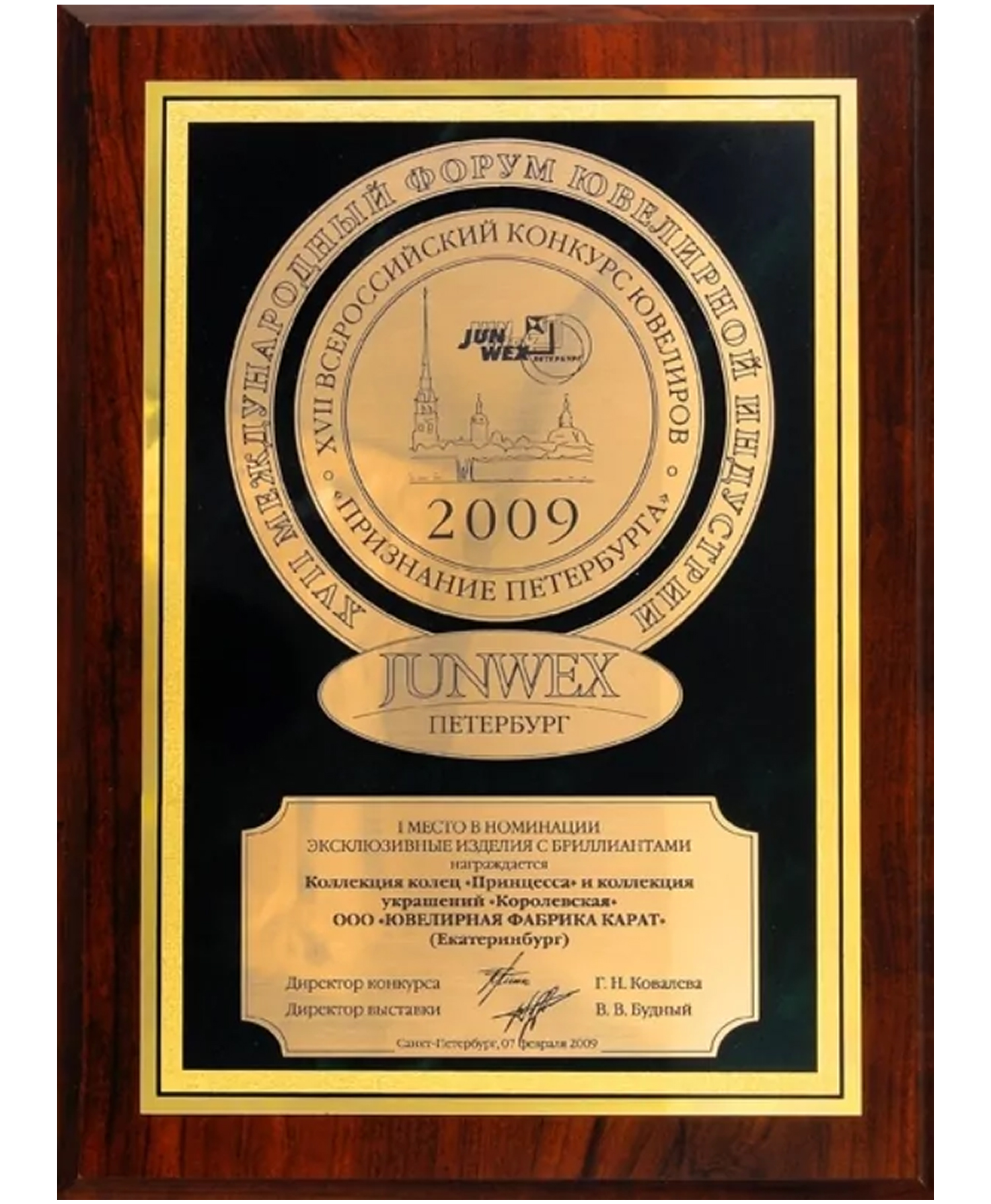 Диплом Junwex Петербург. за 1 место в номинации "Эксклюзивные изделия с бриллиантами" 2009 г. Коллекция "Королевская" и коллекция колец "Принцесса"