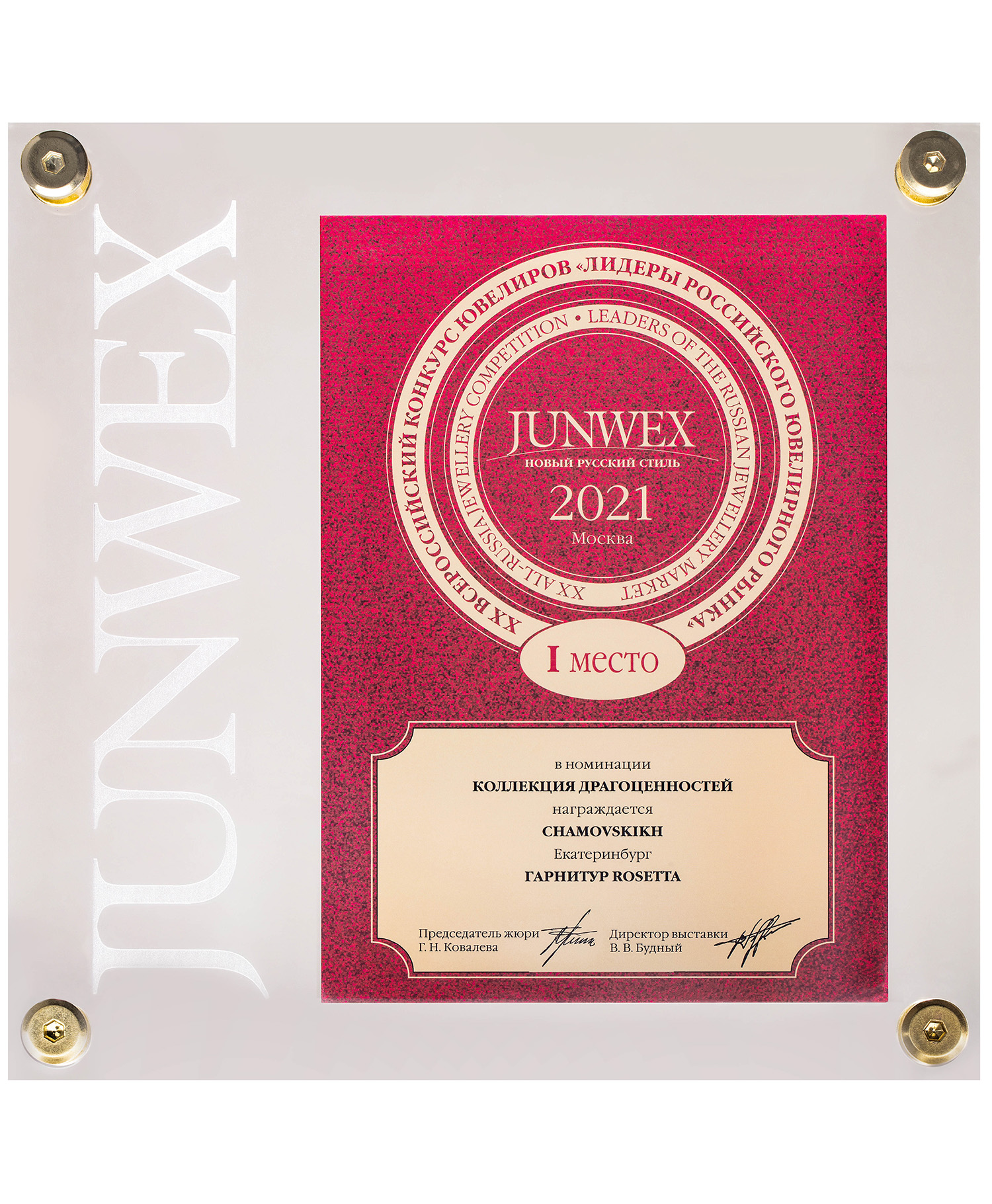 Высшая награда конкурса JUNWEX. Диплом за Первое место в номинации «Коллекция драгоценностей» за создание сета Rosetta с турмалинами, рубинами и бриллиантами 2021г.