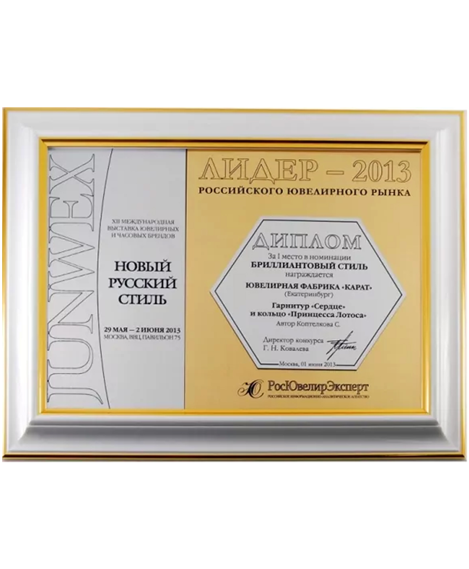 Диплом Junwex Москва. 1 место в номинации "Бриллиантовый стиль" 2013 г. Гарнитур "Сердце", кольцо "Принцесса Лотоса"