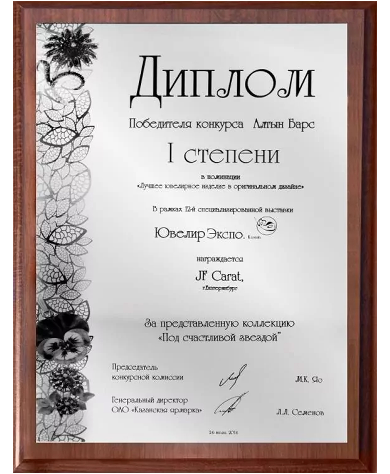 Диплом конкурса "Алтын Барс" 1 степени в номинации "Лучшее ювелирное изделие в оригинальном дизайне" коллекция "Под счастливой звездой"