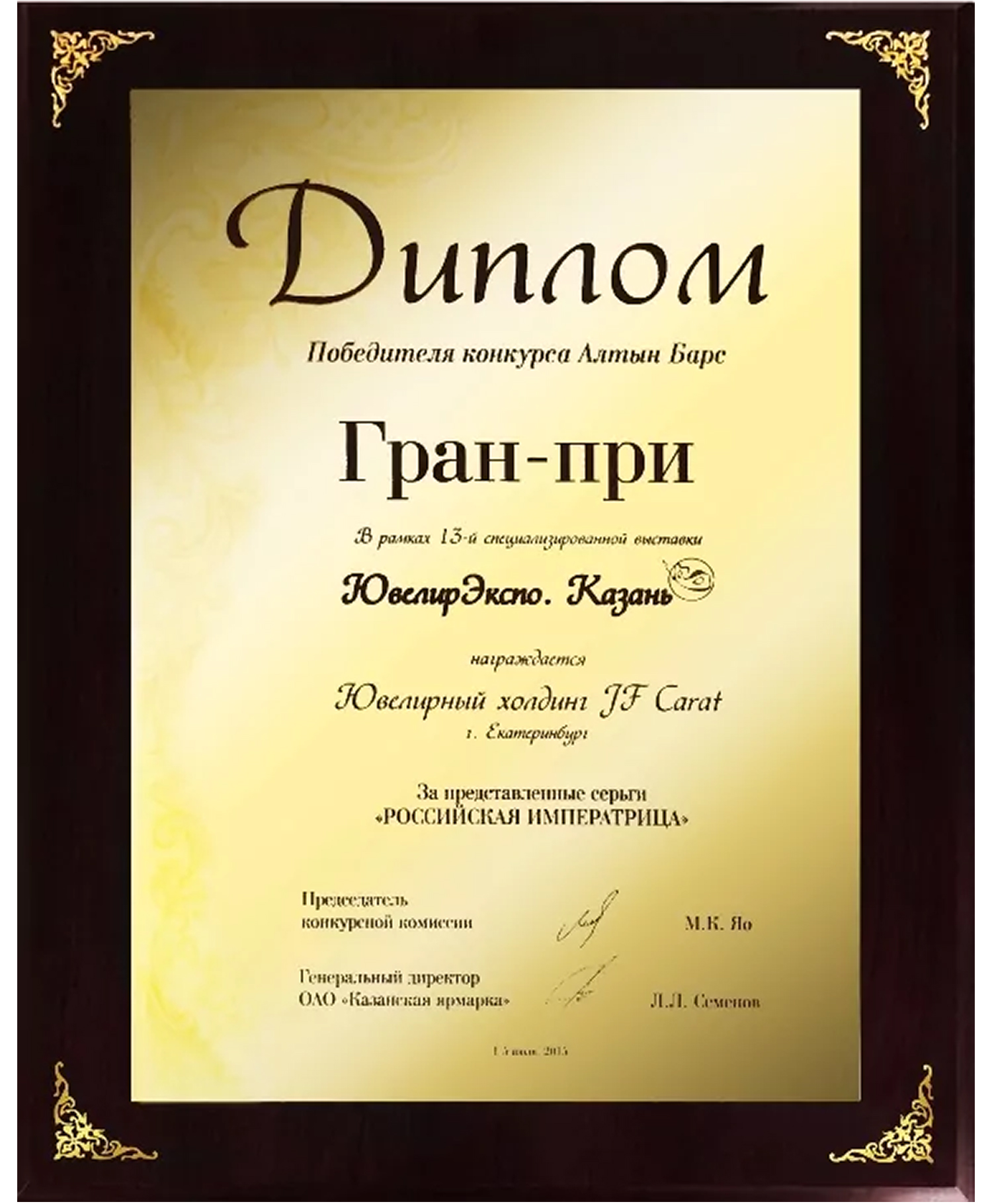 Диплом победителя конкурса "Алтын Барс". Гран-при выставки "ЮвелирЭкспо" 2015 г. Серьги "Российская Императрица"