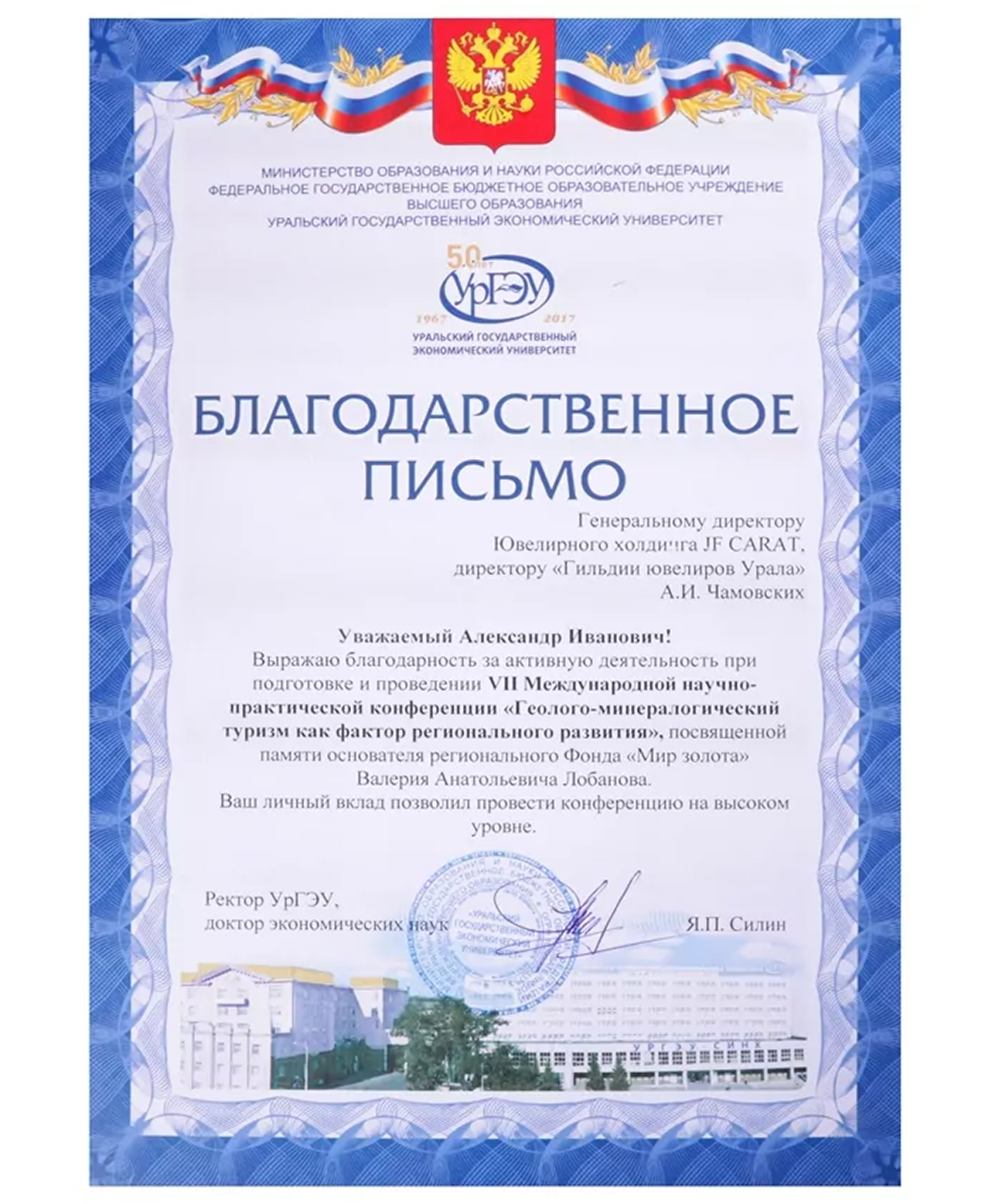 Благодарственное письмо от УрГЭУ