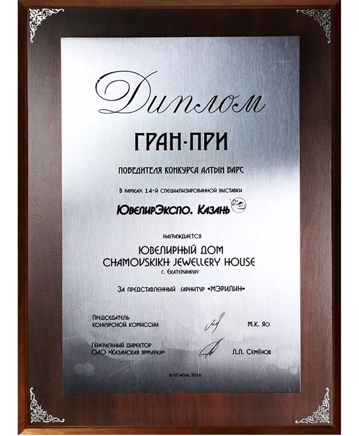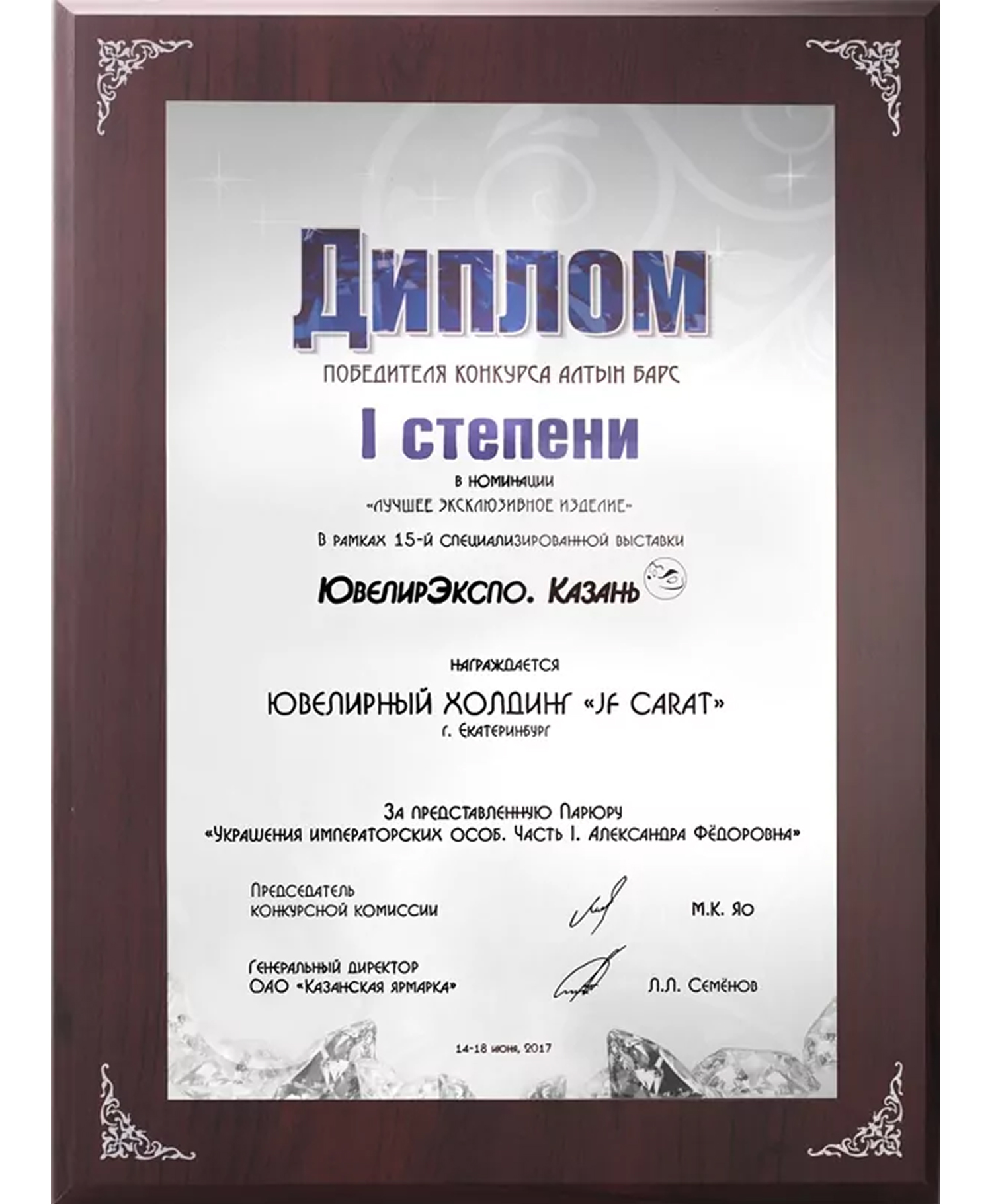 Диплом победителя конкурса "Алтын Барс" 1 место в номинации "Лучшее эксклюзивное изделие" 2013 г. Гарнитур "Сердце океана"