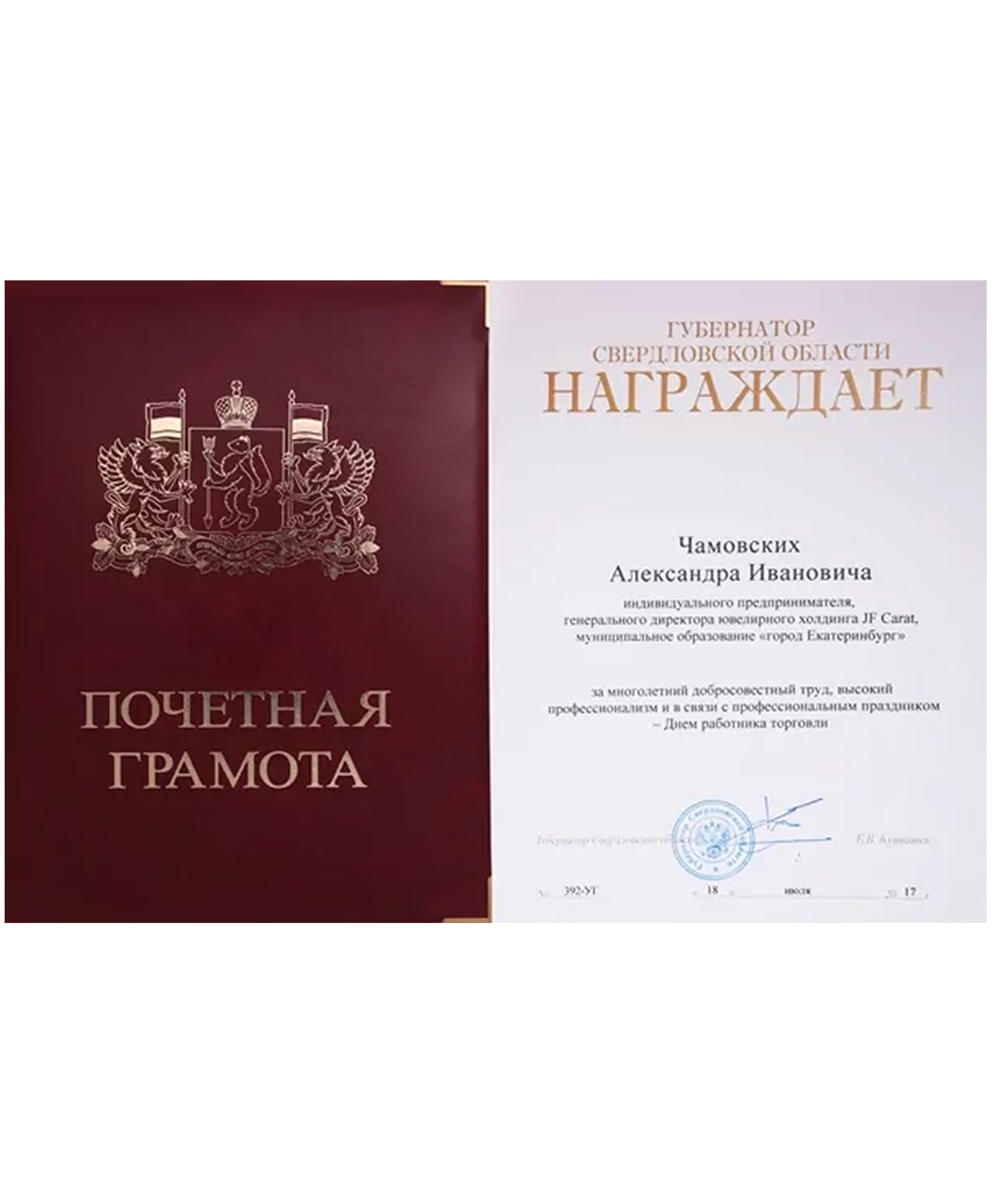 Почетная грамота от правительства Свердловской области
