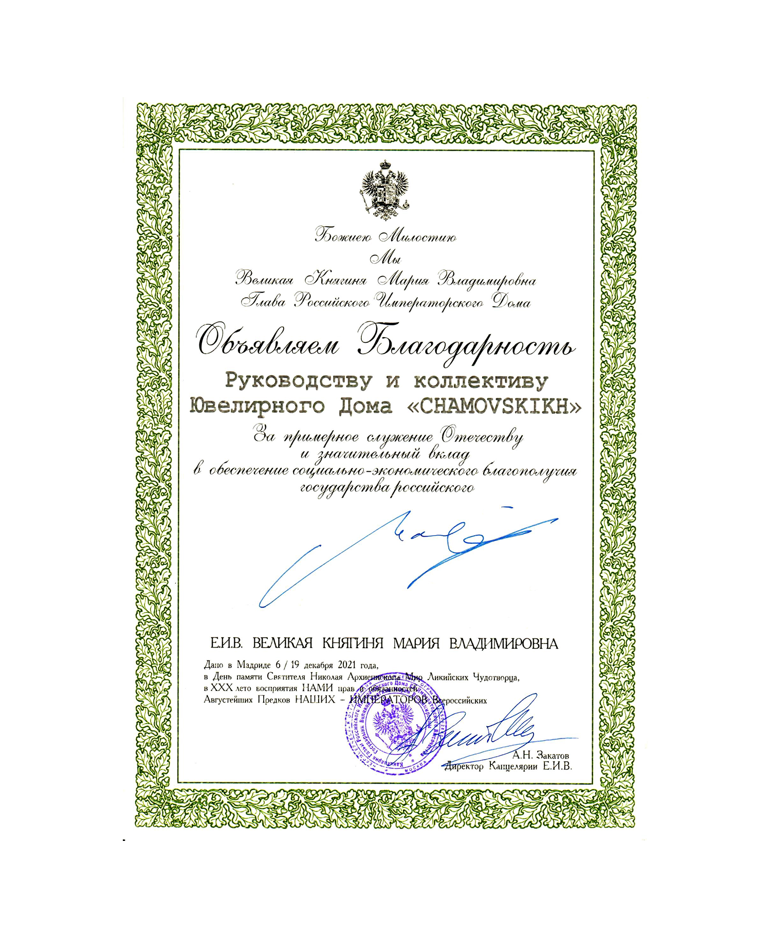 Высочайшая благодарность Главы Императорского дома Романовых за выдающиеся заслуги перед Отечеством.