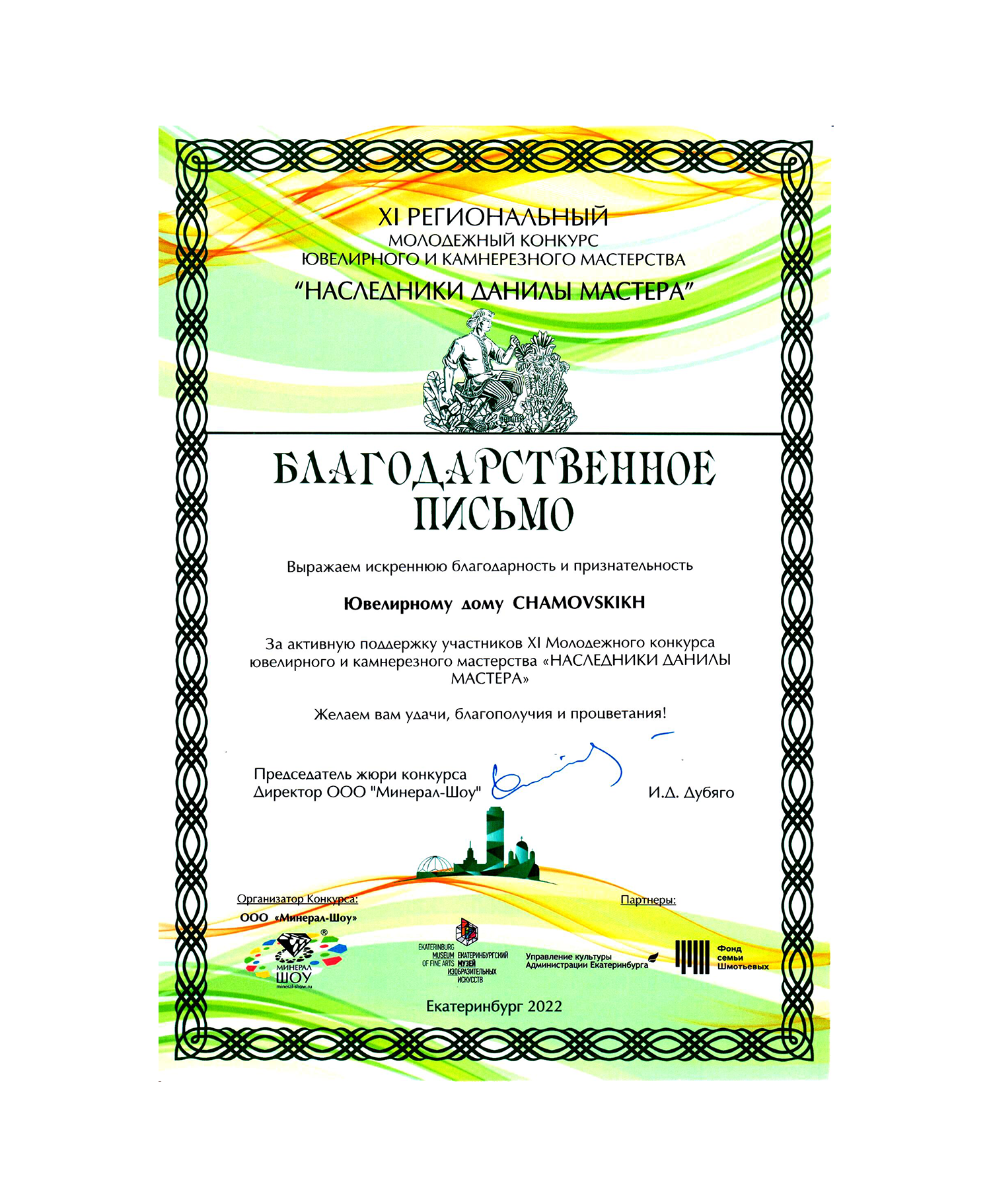 Благодарственное письмо за активную поддержку участников XI Молодежного конкурса "Наследники Данилы мастера"