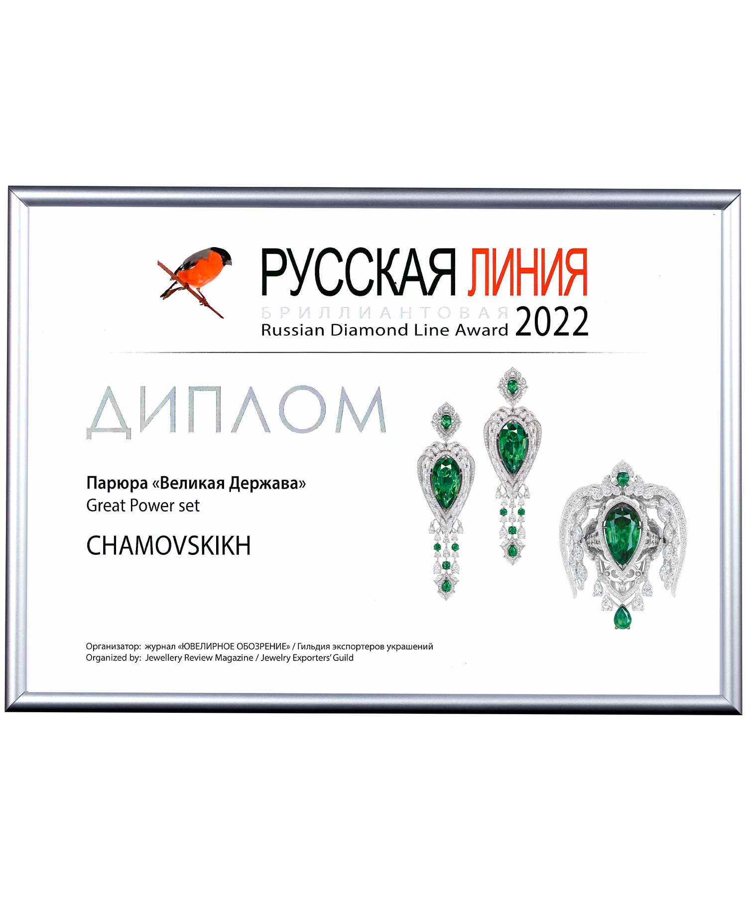 Диплом Junwex Москва. 1 место в номинации "Драгоценный камень" 2015 г. Серьги "Российская Императрица"