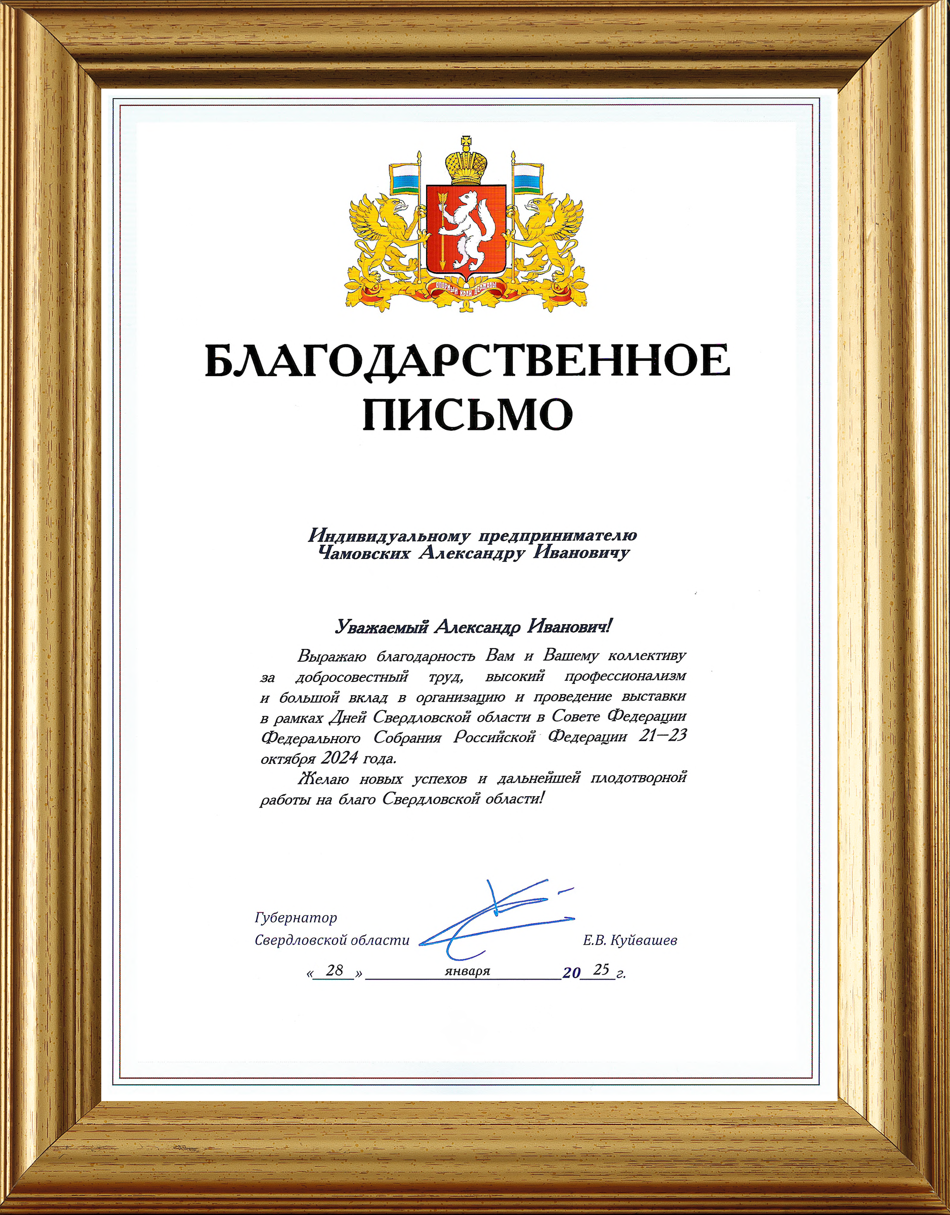 Благодарственное письмо от губернатора Свердловской области