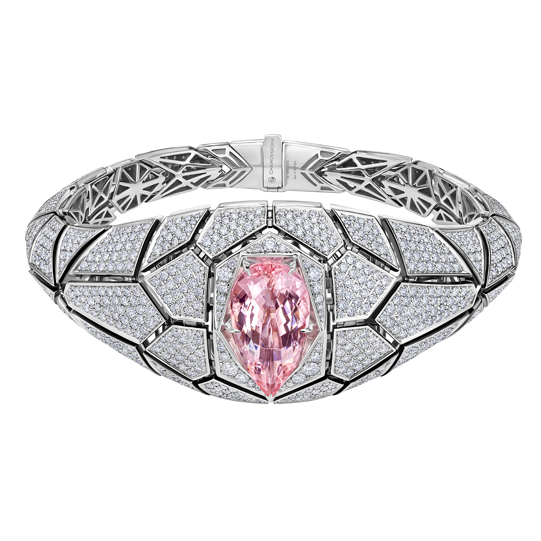 Символ столицы Малайзии — Башни Петронас нашел ювелирное воплощение в изысканном браслете-манжете «Куала-Лумпур». Морганит насыщенного оттенка Purplish Pink и геометричный орнамент передают уникальный колорит страны, рожденный синтезом ар-деко и национальных мотивов азиатского мегаполиса.