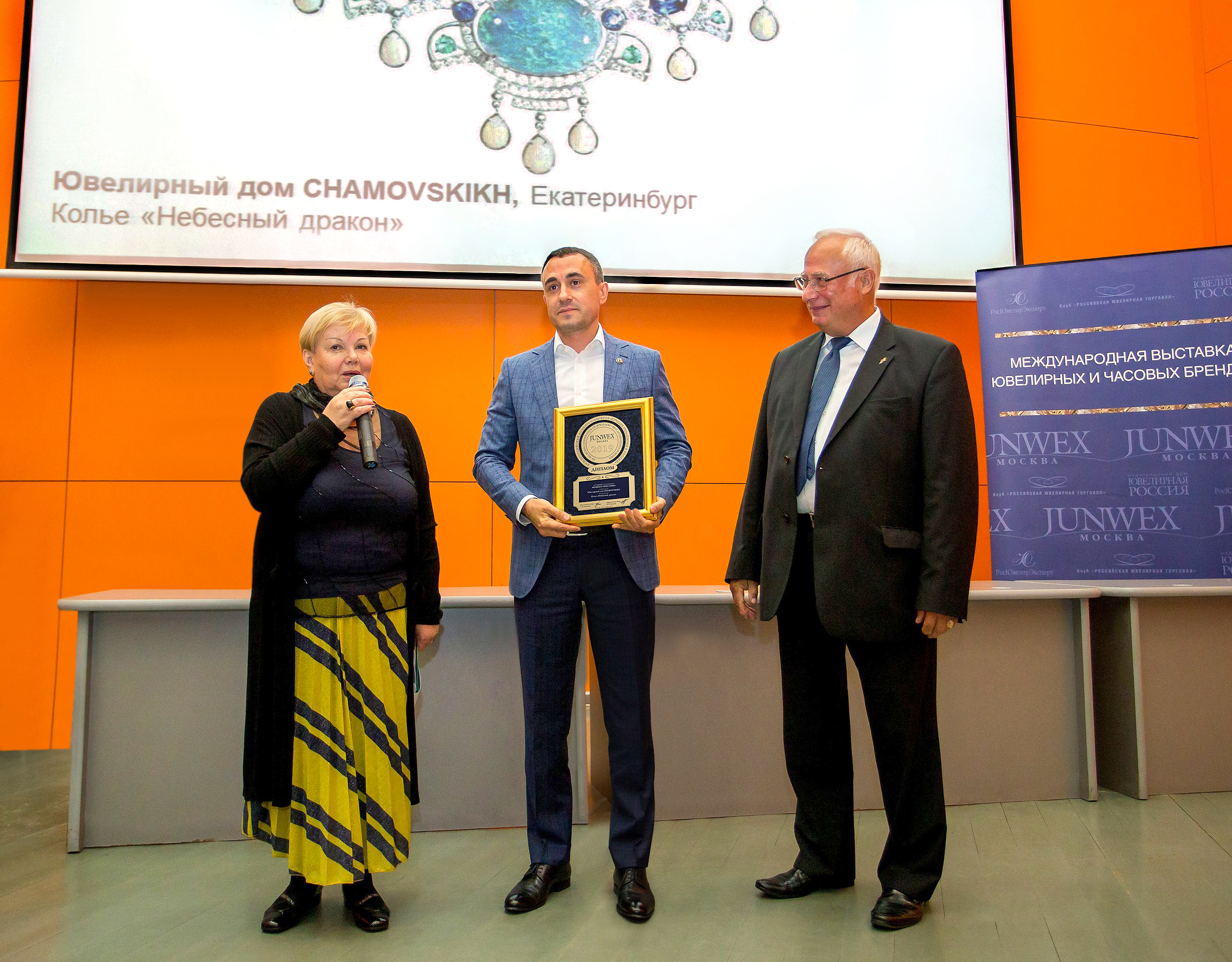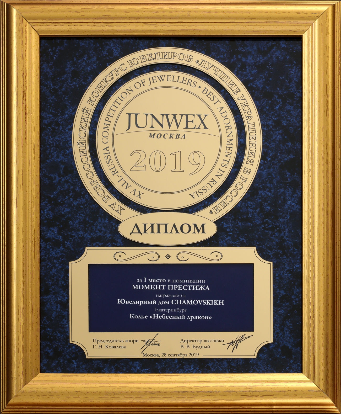 По итогам конкурса на международной выставке ювелирных и часовых брендов JUNWEX ювелирный дом CHAMOVSKIKH завоевал первое место. Колье «Небесный дракон» стало лучшим в номинации «Момент престижа». Профессиональное жюри впечатлил эффектный дизайн, который подчеркнул красоту редкого австралийского опала, виртуозная проработка деталей и свойство трансформации украшения.