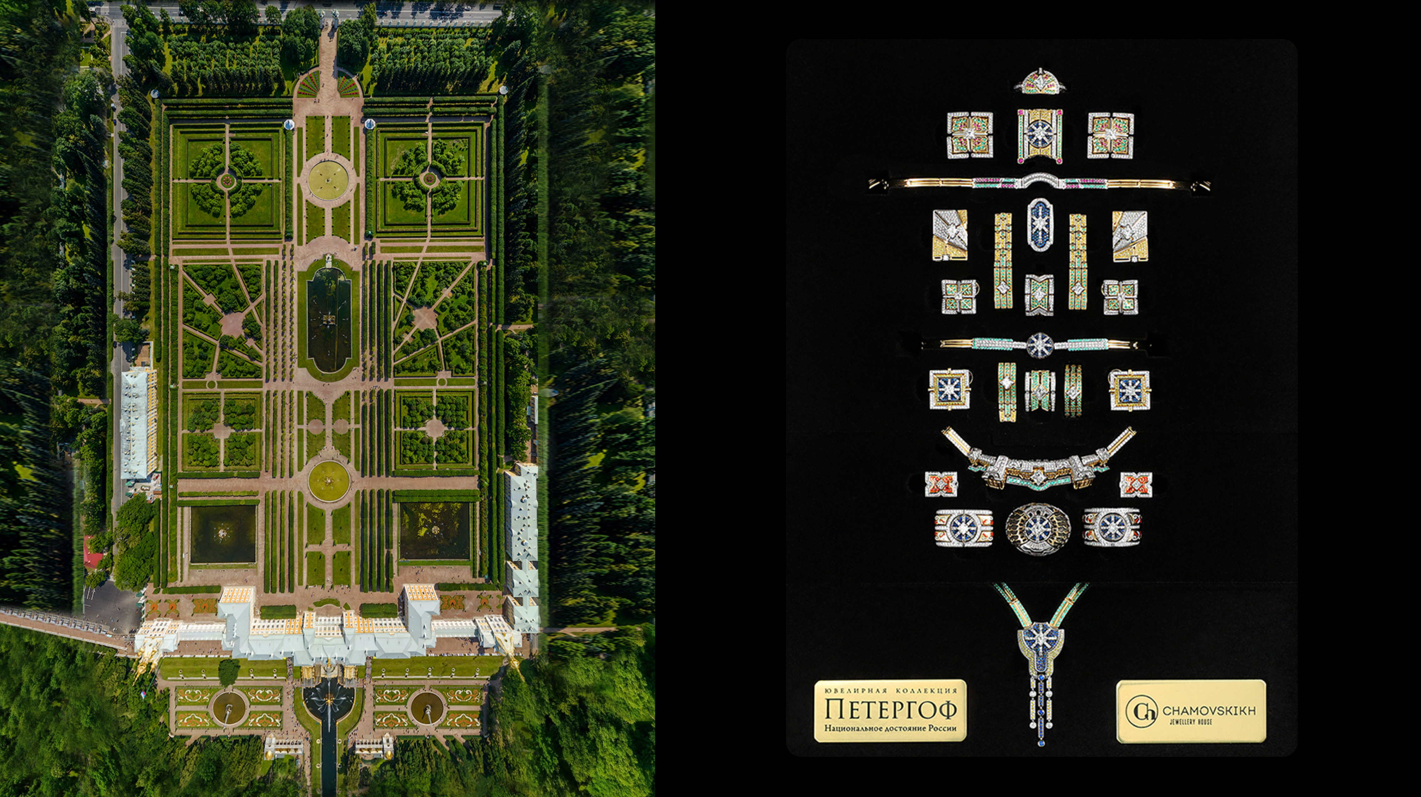 Грандиозный Петергоф, поражавший воображение современников, вдохновил художников CHAMOVSKIKH на создание масштабного историко-культурного проекта — коллекции, навеянной известными петергофскими образами. Двадцать элементов гарнитура повторяют план царской резиденции. Золотая миниатюра инкрустирована бриллиантами, рубинами, изумрудами и сапфирами. С 2016 года коллекция выставлена в «Особой кладовой» Большого Петергофского дворца Государственного музея-заповедника «Петергоф».
