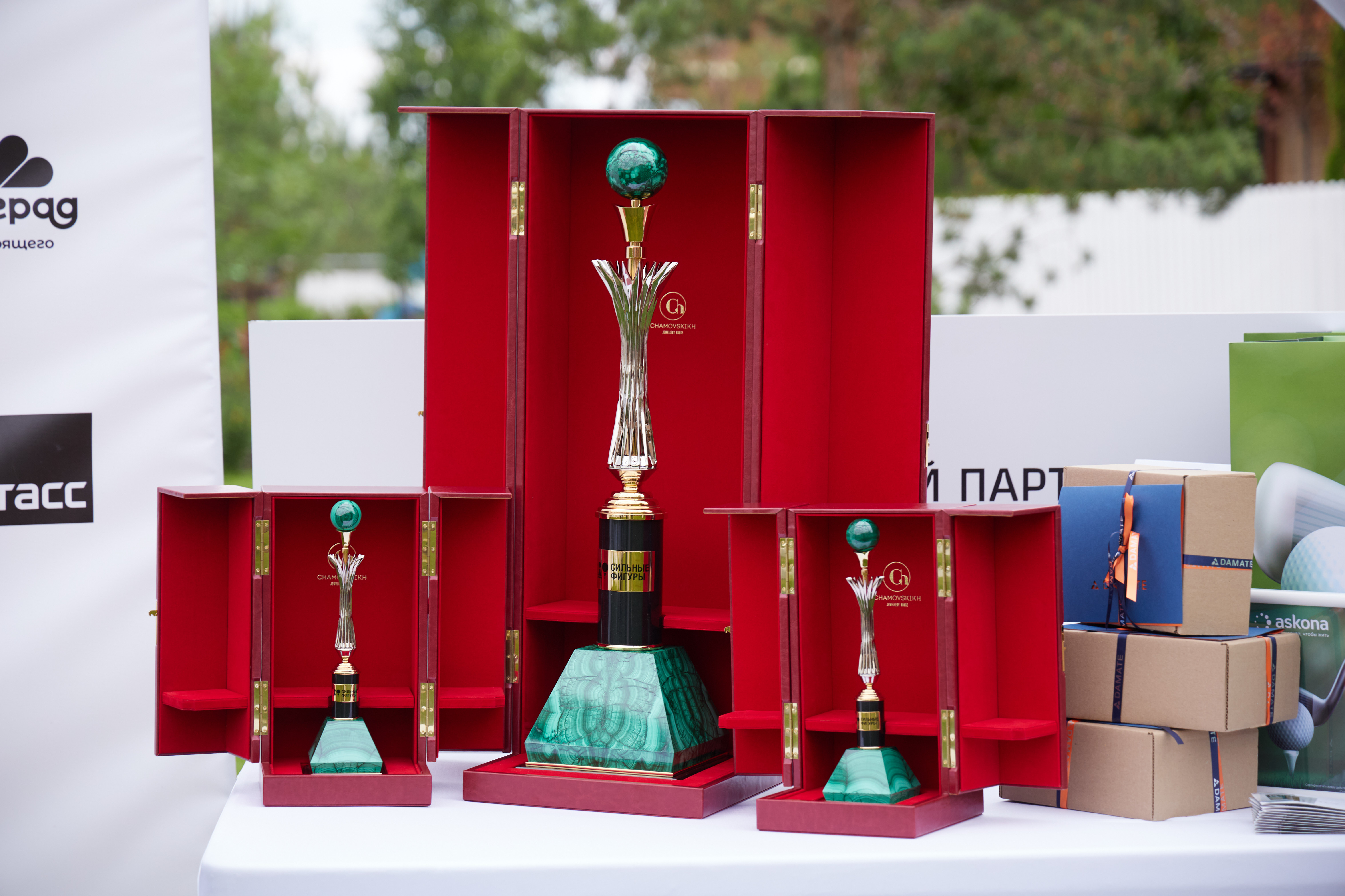 Главной наградой для победителей стали кубки, изготовленные ювелирным домом CHAMOVSKIKH. Спортивный трофей, выполненный из ценных поделочных камней — малахита и долерита, имеет устремленную вверх композицию, напоминающую лучи славы. Чистое золото покрывает металлические элементы конструкции. Венчает кубок малахитовый шар, символизирующий, одновременно, теннисный мяч и мир большого тенниса.