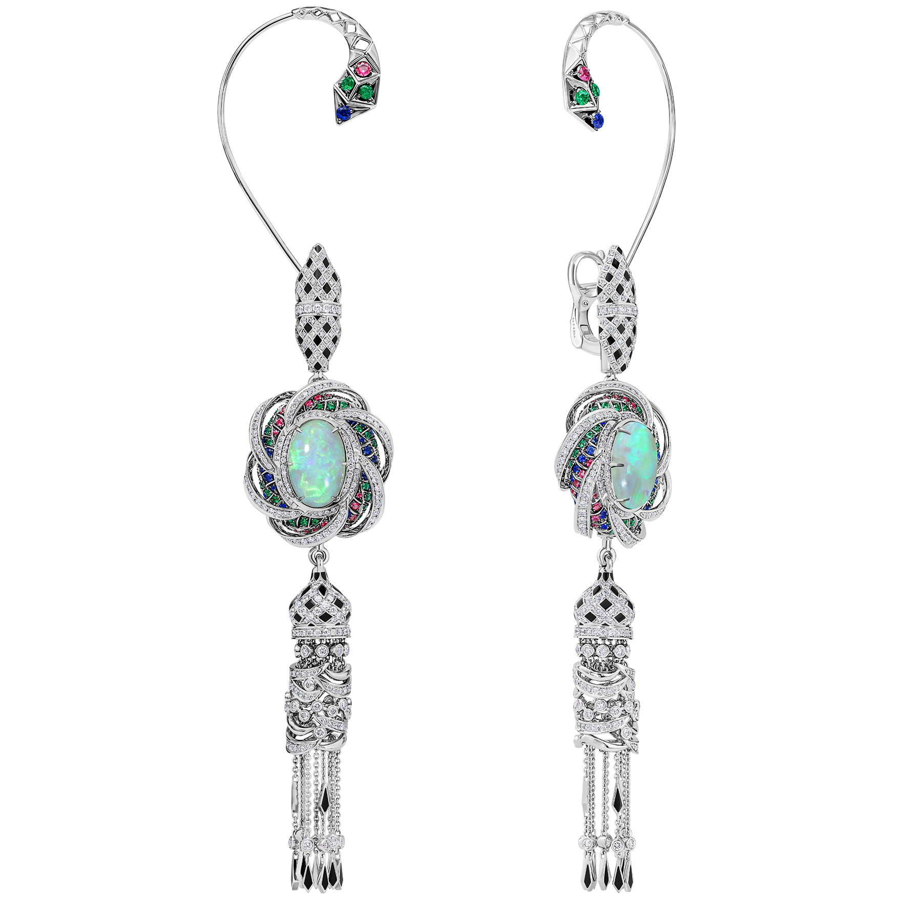 В удлиненных серьгах «Гуджарат» ориентальные мотивы соединяются с европейским дизайном, индо-исламская орнаментика — с актуальными трендами High Jewellery. В центре украшений солирует пара коллекционных австралийских опалов общим весом более 9 карат. Игру полихромных всполохов поддерживают насыщенные оттенки превосходных изумрудов, сапфиров и рубинов. Особенно выигрышно яркая палитра смотрится в сочетании с благородным сиянием белого золота и 810 бесцветными бриллиантами. Основание подвесного элемента напоминает ажурные купола Махабат Макбара. Восточную роскошь уравновешивают подвижные золотые цепи, собранные в изящные кисти. В контексте statement-украшения изысканно и гармонично выглядят съемные кафы, инкрустированные цветными драгоценными камнями.