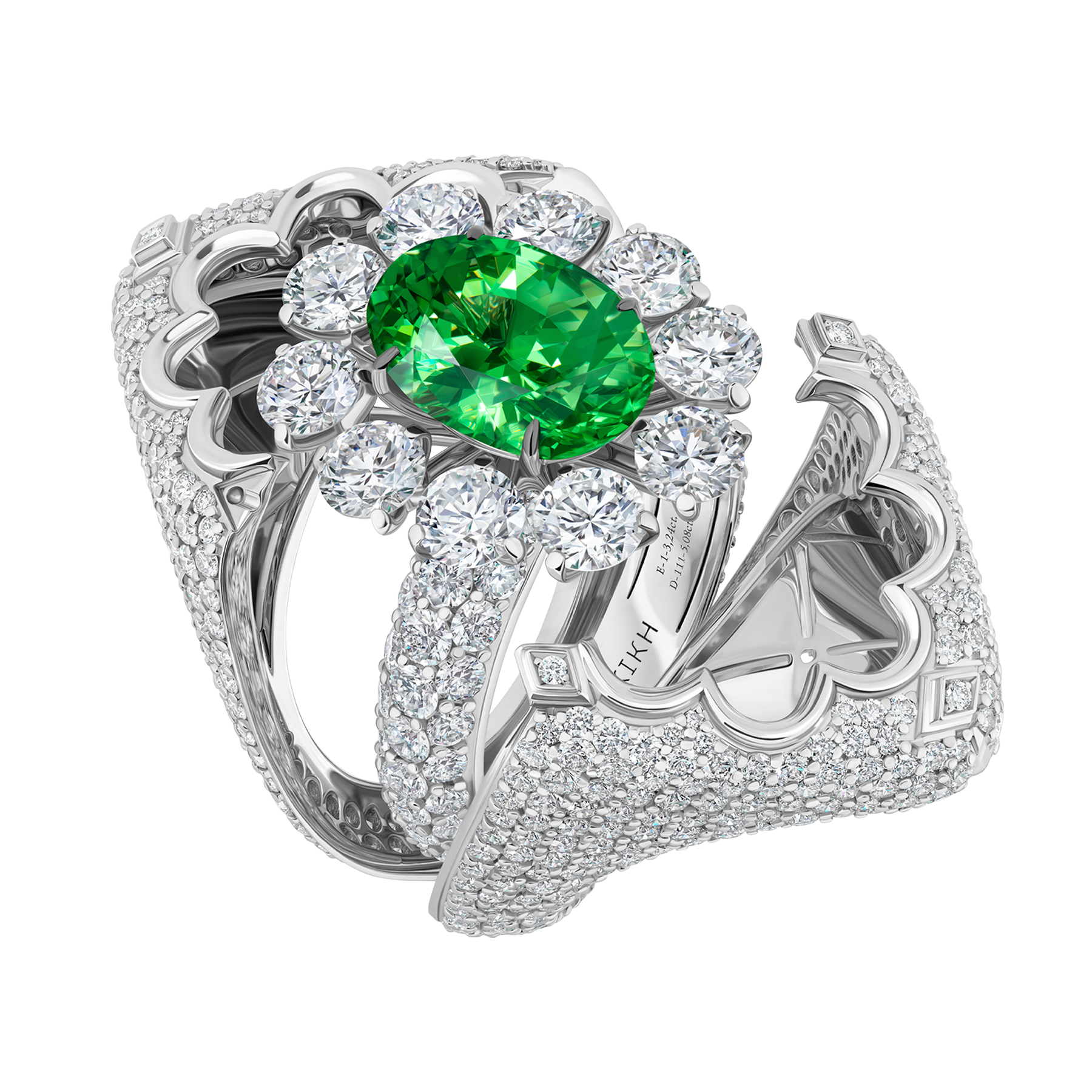 Тсавориты премиальных характеристик играют яркую роль в новой коллекции Invisible Inlay, представленной Домом CHAMOVSKIKH. В основе ювелирных образов — природные мотивы, воспевающие красоту первозданного мира. Сотни самоцветов и драгоценных камней: бриллиантов, рубинов и сапфиров соединяются в единое целое, создавая драгоценный мир, где среди экзотических растений можно встретить удивительных бабочек и очаровательных насекомых. Уникальность украшений обусловлена еще и техническими особенностями коллекции. При ее создании ювелиры применили сложнейший способ «невидимой» закрепки камней. В данном случае самоцветы не имеют оправы, а устанавливаются на скрытые металлические направляющие. В результате взору предстает сплошная драгоценная поверхность, удивляющая интенсивным сиянием и тонким цветовым градиентом.